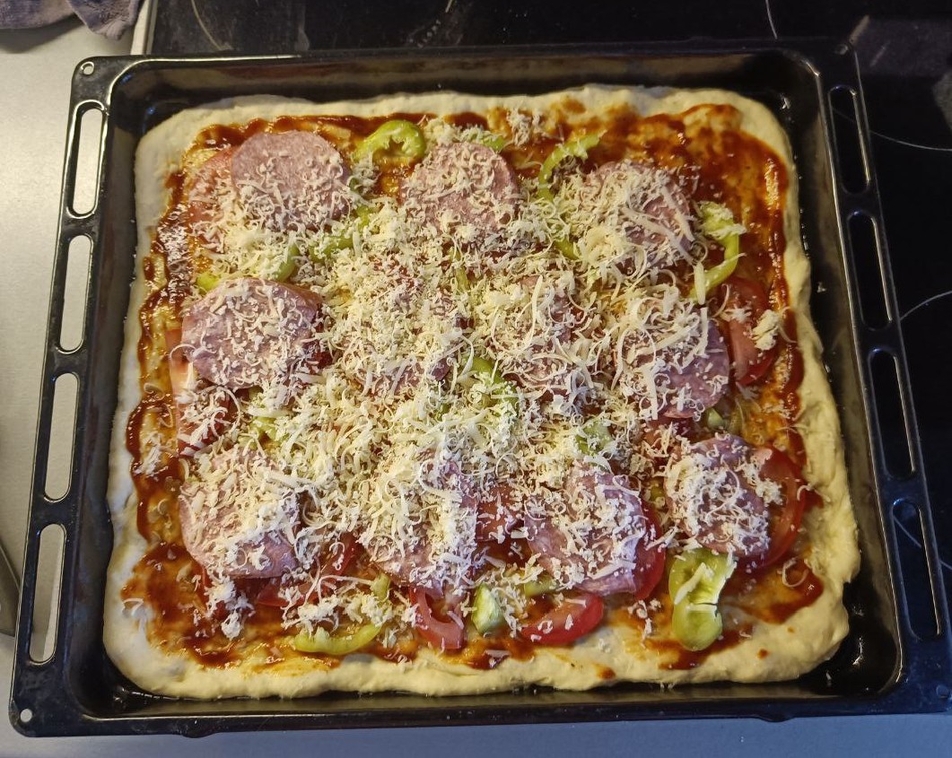 Пицца с колбасой и сыром в духовке классическая