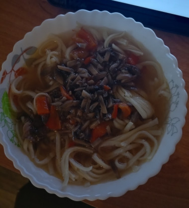 Достаточно простой и быстрый в приготовлении суп. Удон нужно варить на один раз, иначе он слипается и его не разделить, я варила на утке, получилось очень вкусно. Некоторые ингредиенты убрала, потому что не оказалось в "холодильнике".