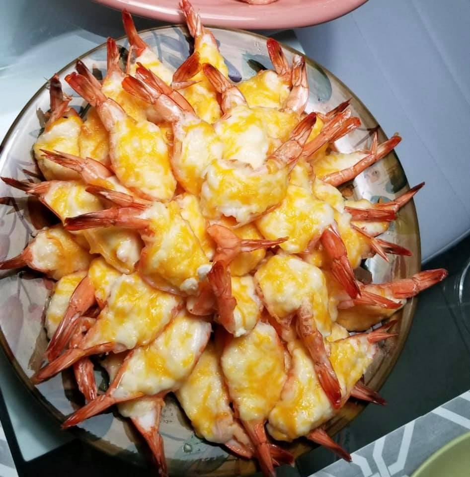 Берём замороженные raw tail on shell on креветки, мы лично берём в Sam’s club Members Mark jumbo size 21-30, немного размораживаем в комнатной температуре, затем разрезаем вдоль позвоночника раскрыв их «бабочкой». Пока креветки размораживаются, мелко нарезаем из того же Сэмс Клаба (но не обязательно оттуда) crab meat imitation и смешиваем с обычным Real Mayonnaise чтобы получилась кашицеобразная масса. Выкладываем эту массу на каждую из креветок и сверху посыпаем Mexican blend shredded cheese мелкого помола. Включаем духовку на 400 градусов по Фарингейту и ставим на 20 минут.