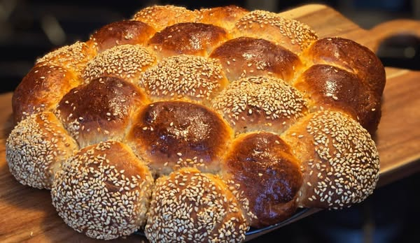В большой миске смешать остальную муку, сахар, соль, раст. масло, опару, вымесить на смазанной раст. маслом поверхности, руками, тоже смазанными маслом, сделать большой шар, накрыть полотенцем, расстойка полтора часа. Разделить на 20-25 равных кусочков, сделать шарики, лепить руками, смазанными раст. маслом. Смазать противень или круглую форму раст. маслом. Сформировать из булочек круглую халу, не очень плотно, чтобы осталось место для поднятия, растойка ещё 30 минут и выпекать при температуре 200°С или 392°f 20- 25 минут перед выпечкой смазать яичным желтком. Можете присыпать кунжутом или маком.