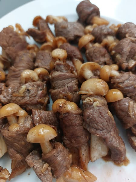 Итак, нужна очень тонко нарезанная говядина, можно наверное и свинину. Чем тоньше мясо, тем нежнее и вкуснее. Наверное чтобы тоньше нарезать хорошо бы слегка заморозить мясо заранее. В мясо заворачиваются маленькие грибочки Shimeji. Все это тушить в соевым соусе, чеснок и имбирь на терку, немного оливкового масла, чёрного перца и коричневого сахара. В конце посыпать кунжутом (я забыла ).