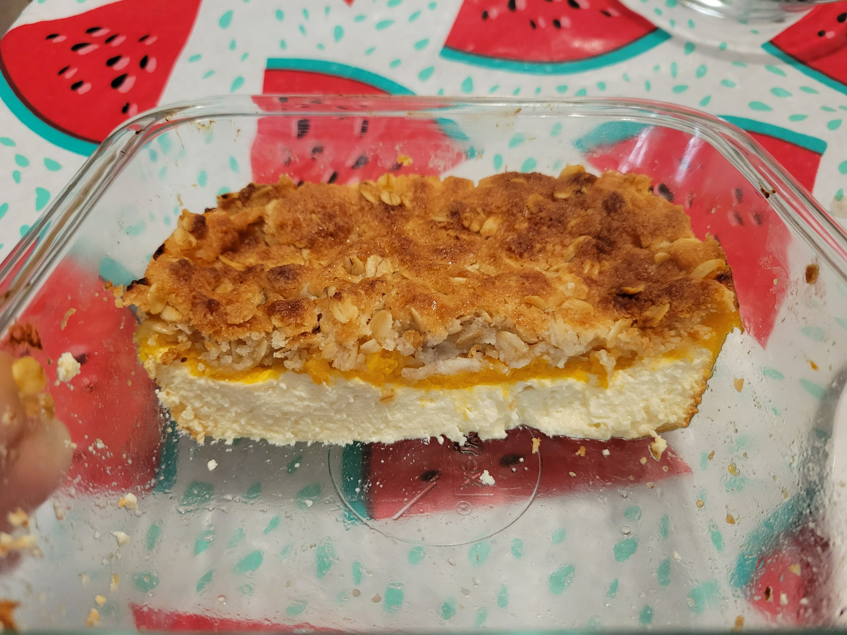 Это трехслойный пирог, снизу вверх - творожный слой, ягодный/фруктовый, насыпной слой (крамбл).
