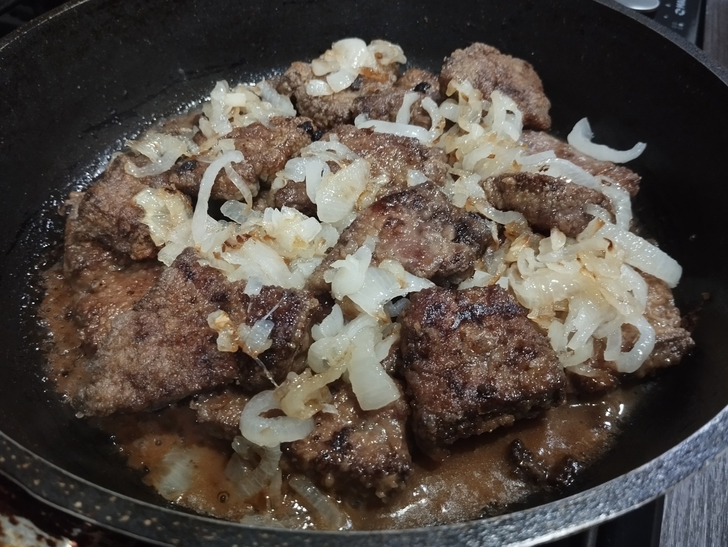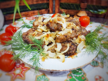 Жареная печень говяжья с луком на сковороде мягкая