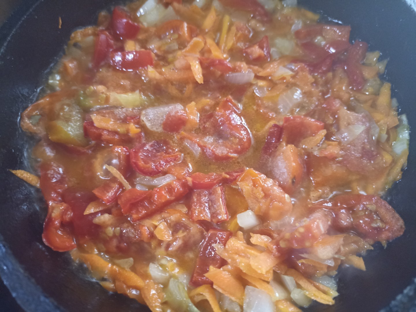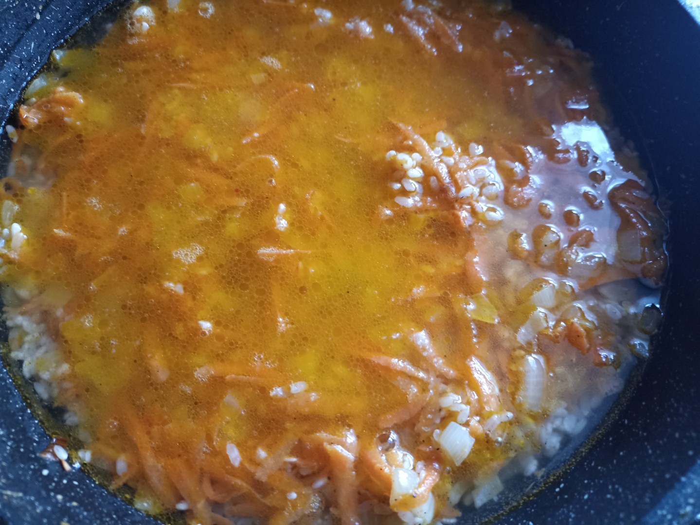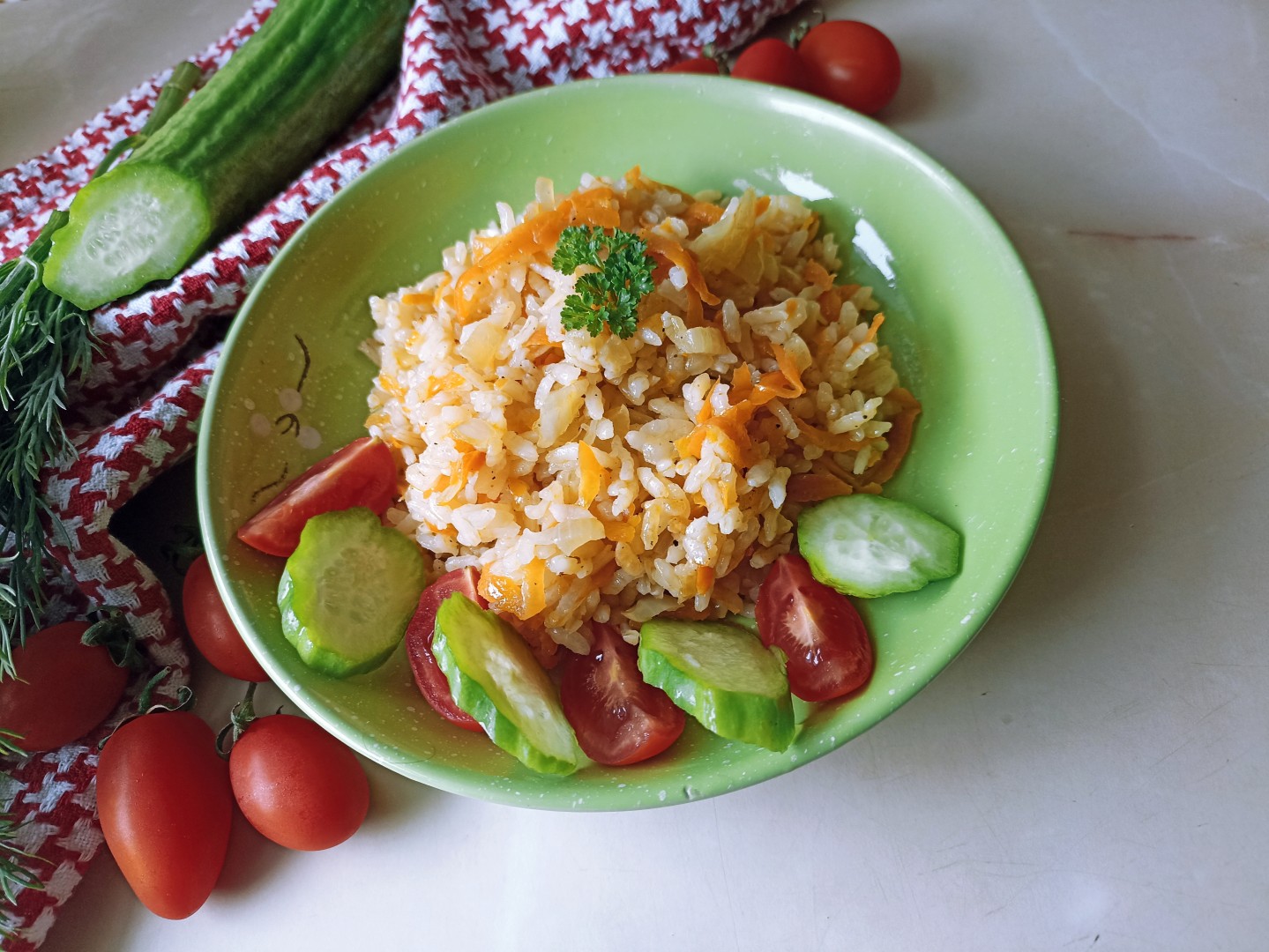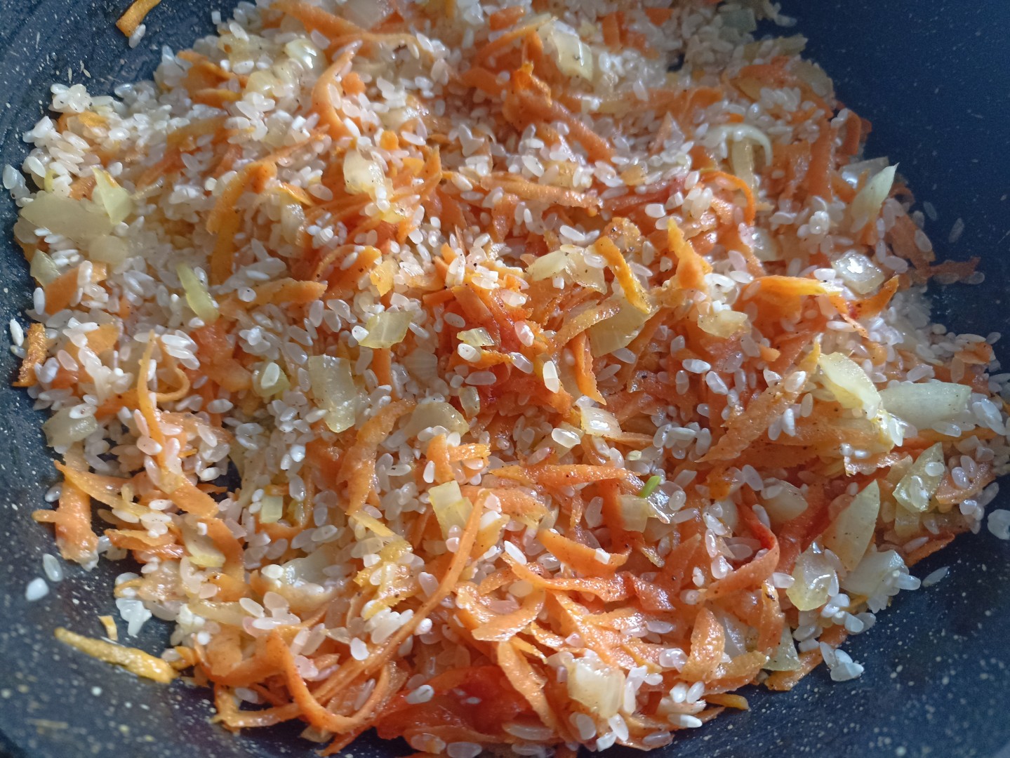 Приготовила тушеный рис. В первую очередь хорошо промыла рис и откинула его на сито, так как в рецепте его нужно немного обжарить с овощами и лишняя влага здесь не нужна. В это время почистила овощи, лук мелко нарезала, морковь натерла на крупной терке. Обжарила овощи на разогретом растительном масле, специи добавила при обжарке ( черный перец и паприку), затем добавила к овощам рис, обжарила помешивая всё вместе примерно 3 минуты. Залила холодной водой, присолила, тушила под крышкой на слабом огне до выпаривания жидкости. Отключила нагрев и оставила рис под крышкой " доходить". Тушёный таким образом рис получается мягким, но рассыпчатым, а овощи добавляют блюду аромат и сочность. Можно подавать как самостоятельное блюдо, либо как гарнир. Спасибо за рецепт, katushafin!
