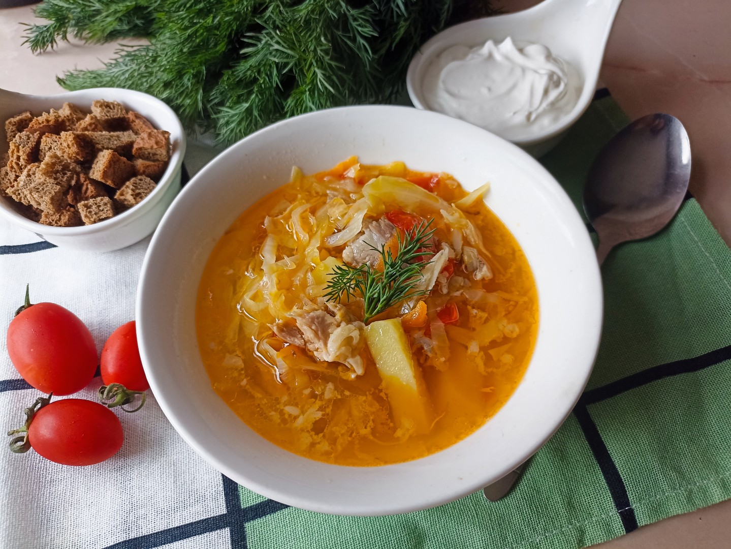 К обеду приготовила суп с капустой и мясом. Для бульона использовала свиные рёбрышки. Свежий помидор заменила замороженным, добавила дополнительно замороженный болгарский перец. В остальном готовила по рецепту. Подавала суп с ржаными сухариками и сметаной. Очень вкусный суп, наваристый, ароматный ,с приятной кислинкой. Спасибо за рецепт, Лялич!