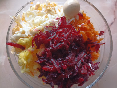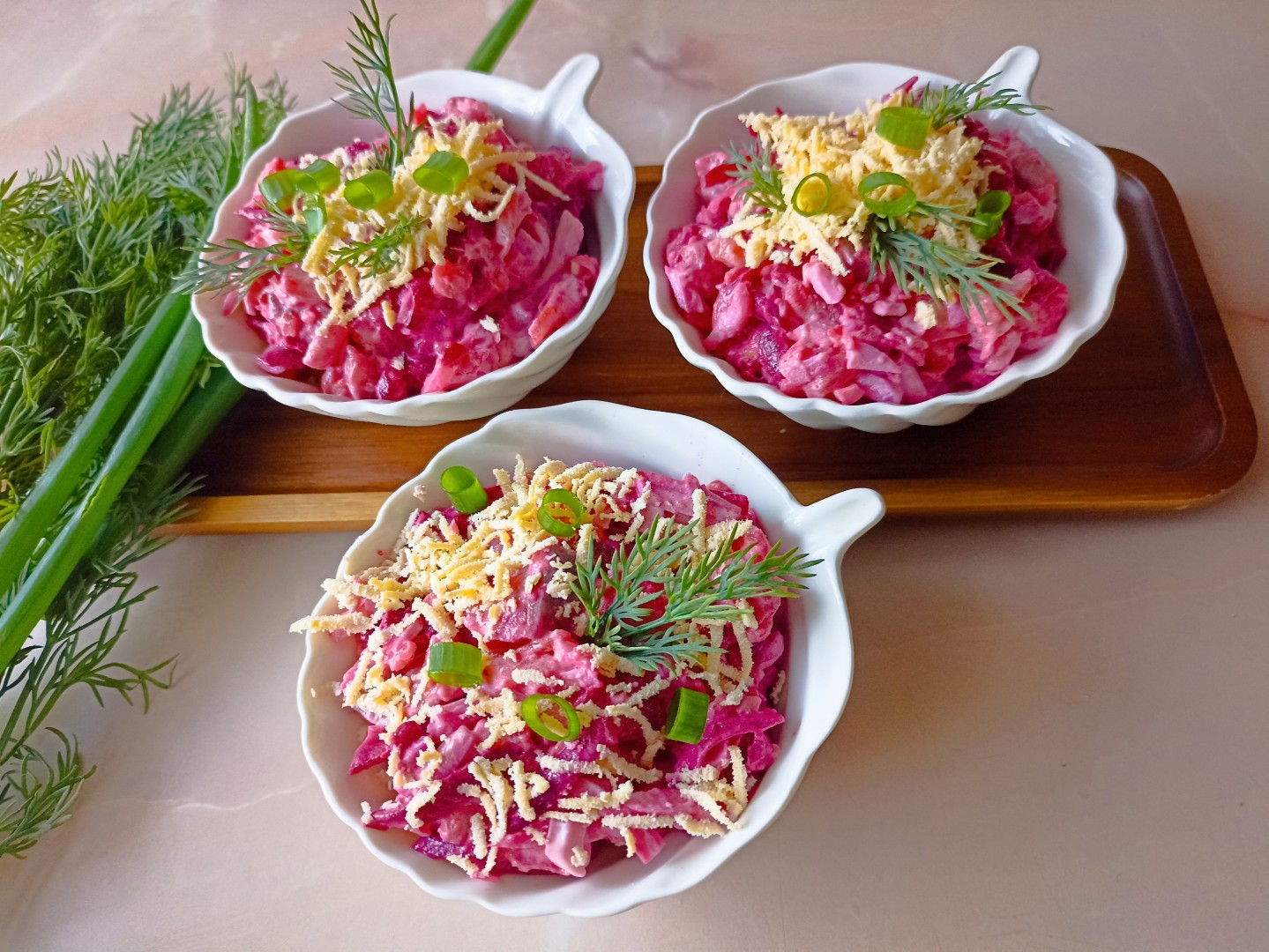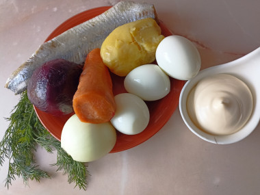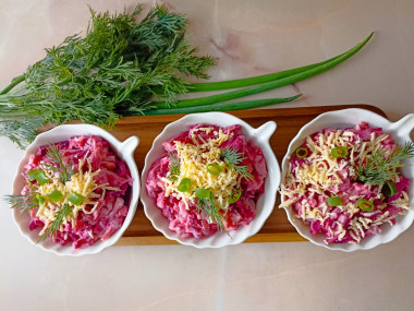 Приготовила ленивую селёдку под шубой. Сельдь разделала на филе, нарезала мелким кубиком, выложила в салатник, туда же мелко нарезала репчатый лук, натерла на тёрке остальные ингредиенты, заправила майонезом - салат готов! Получается быстрее, чем при выкладывании слоями и промазывании каждого слоя майонезом , ингредиенты перемешиваются равномерно и вкус от этого выигрывает, на мой взгляд. Получилась" сельдь в коралловой шубке"-так я назвала для себя этот салат за красивый розовый цвет))). Подавала салат порционно. Спасибо автору за удобный рецепт знакомого блюда!