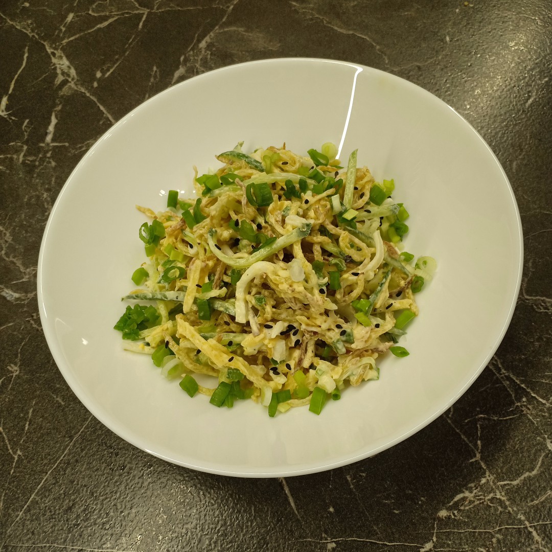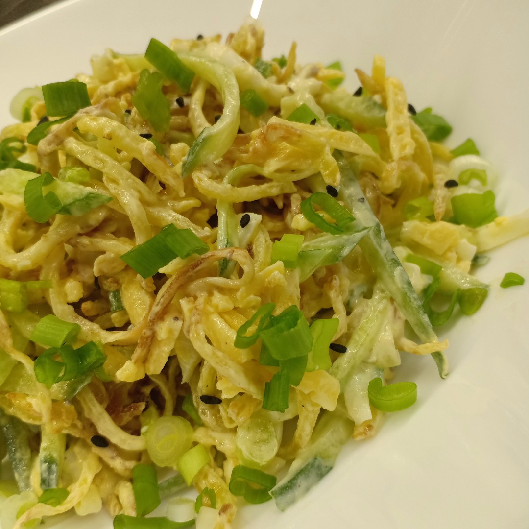 Очень вкусный и освежающий салат из самых простых продуктов. Благодаря обжаренной картофельной соломке, салат приобретает интересную нотку, а в сочетании с остальными продуктами он просто идеален. Мужу очень понравился, сказал, что надо делать почаще. От себя, для более сытного варианта салата, я бы добавила свинину, обжаренную соломкой до румяной корочки.