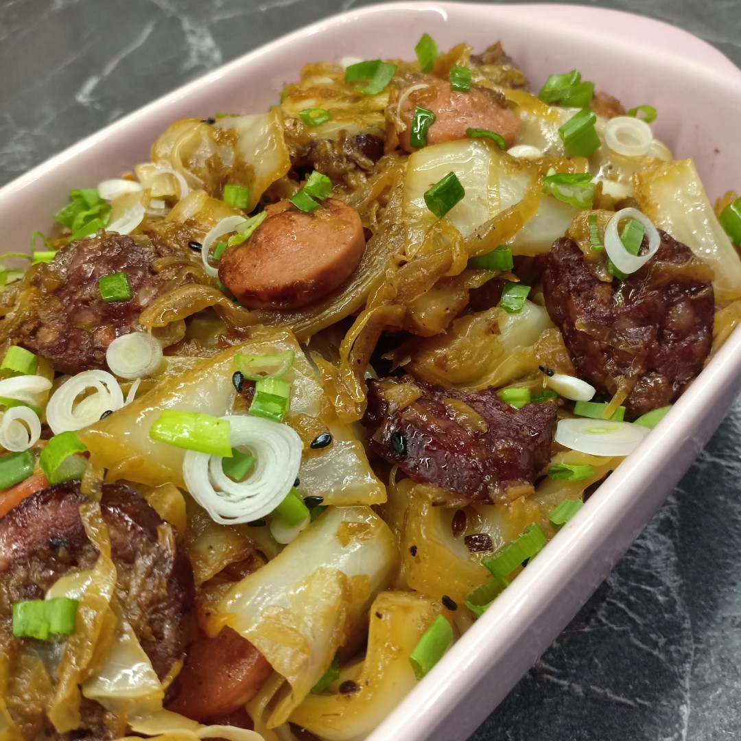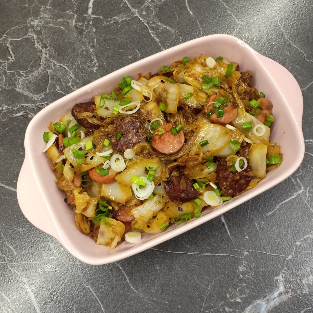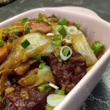 Вкуснейшая капустка получилась, очень понравился рецепт. Добавила немного копченой колбаски для более насыщенного вкуса, ну и когда положила белокочанную капусту в казан, после недолгого обжаривания, добавила ненмнго воды и потушила минут 10 под крышкой, т.к. на капусте были толстенькие прожилки. Получилось очень вкусно. Спасибо автору за рецепт!