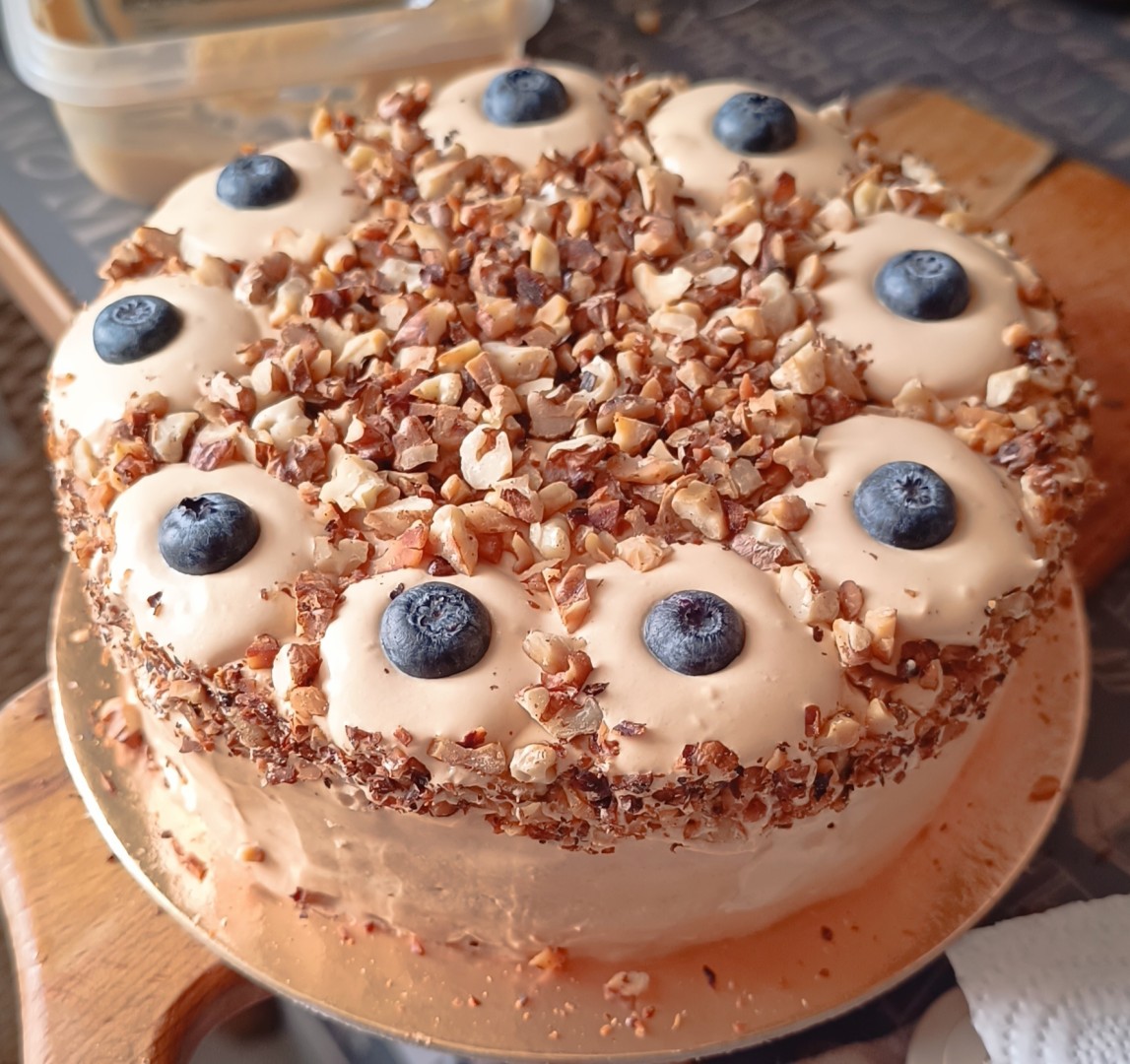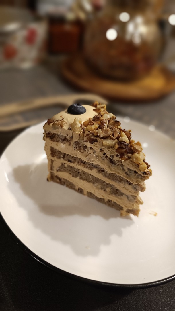 Бисквитные коржи на смородиновом варенье. Пропитка: смородина. Крем: сметана, сливки, вареная сгущенка. Украшение - обжаренный грецкий орех, голубика, крем.