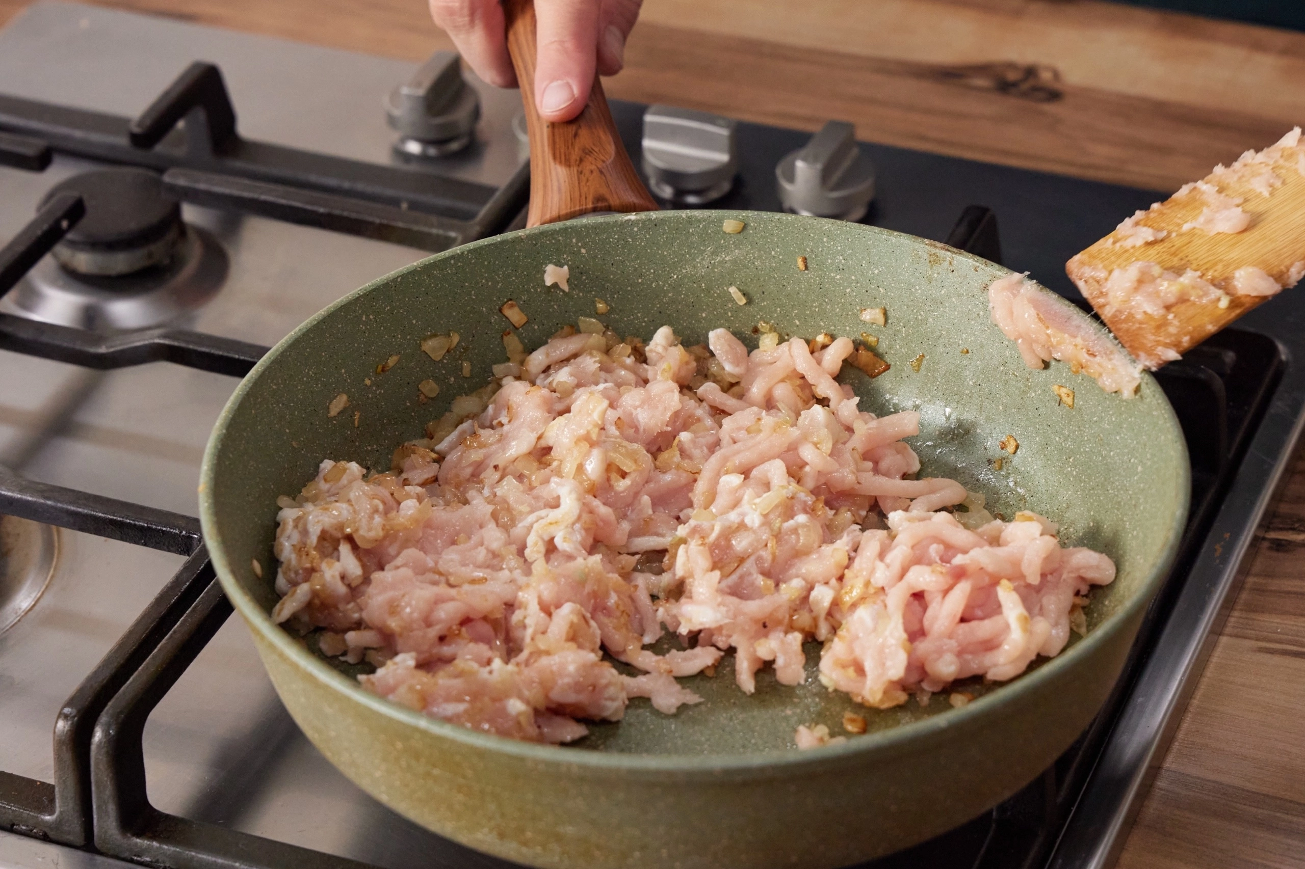* Отправить к овощам фарш и обжарить постоянно перемешивая.