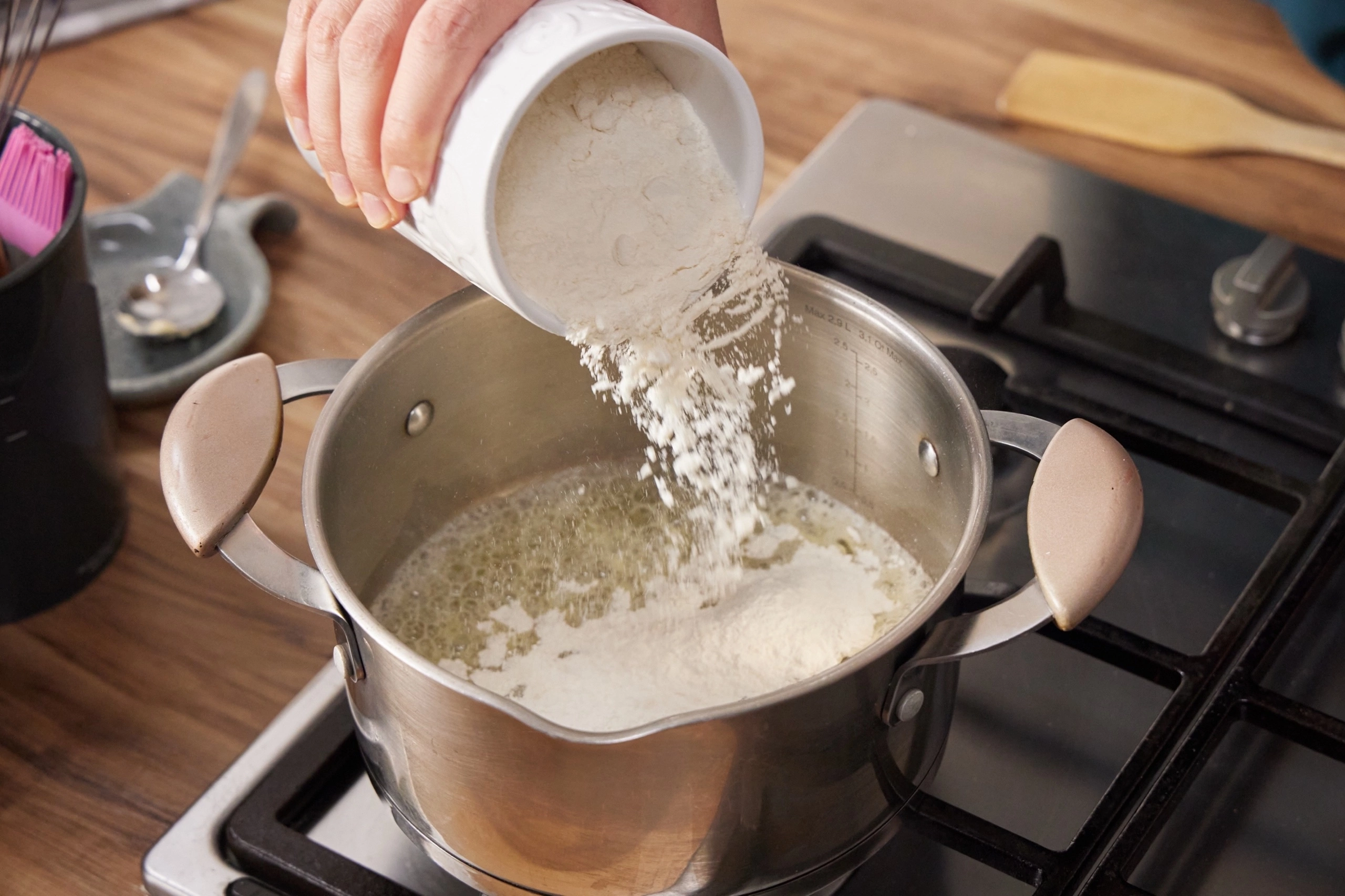 * Затем перемешивая венчиком заваренную муку влить молоко и довести до кипения, перемешать до загустения соуса.