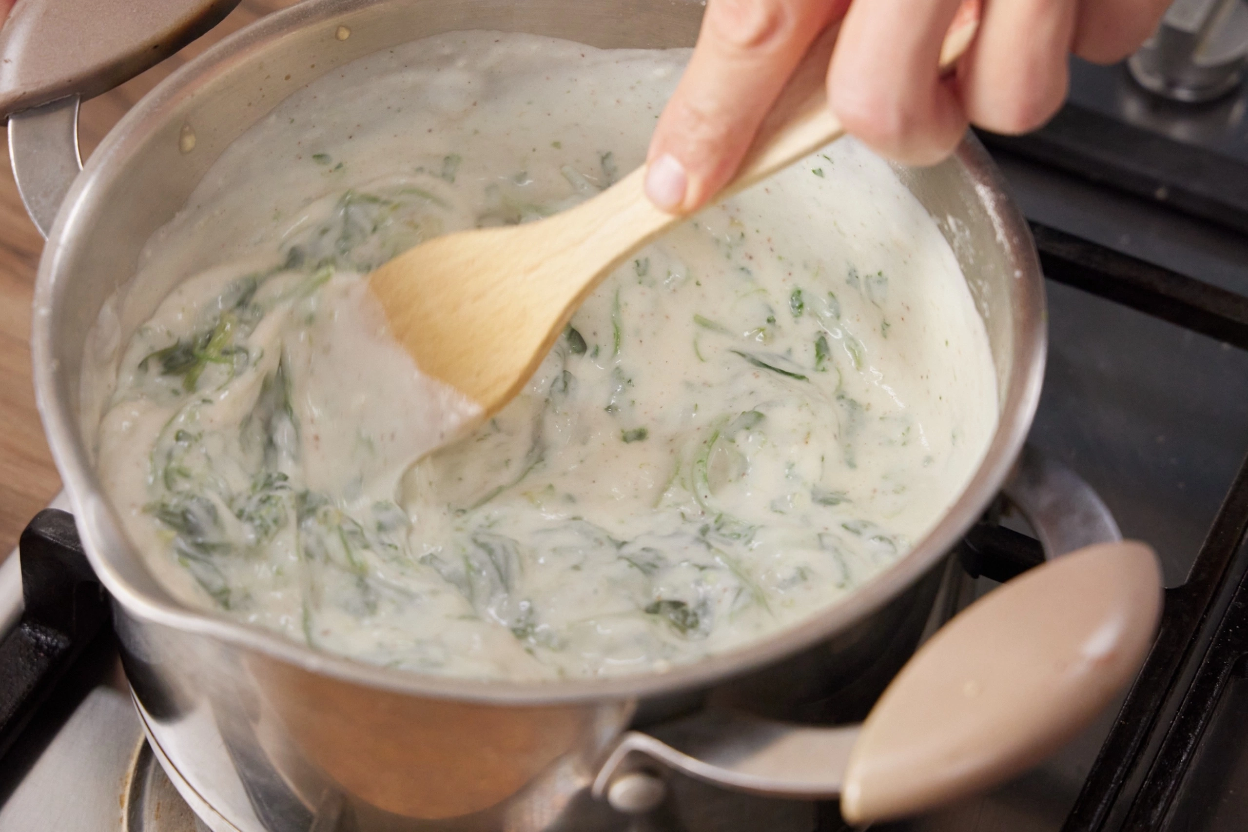 * Отправить в горячий соус шайбы размороженного шпината и перемешать до полного распределения в соусе.