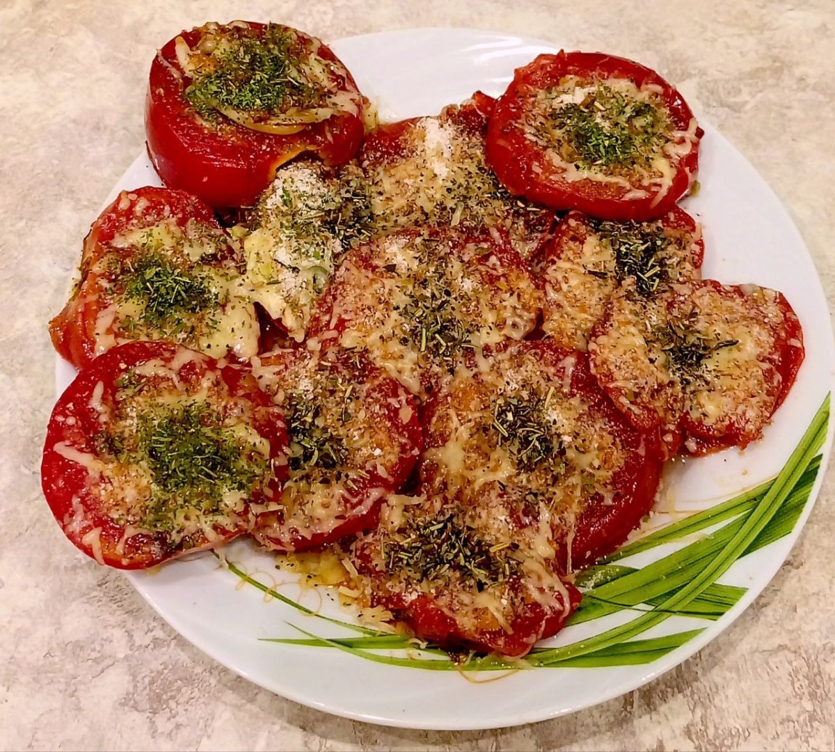 Эти жареные помидоры навеяли мне ассоциации с пиццей! Я добавила к ним сыр, прованские травы и немного петрушки. Блюдо получилось по-летнему легким и красивым. Отличная замена тяжелому мясному ужину